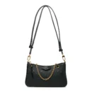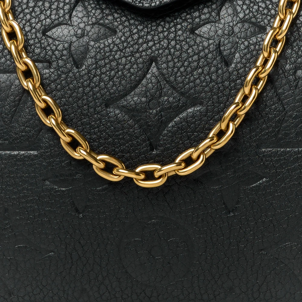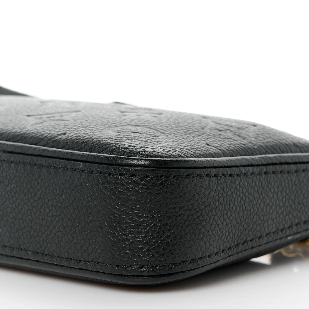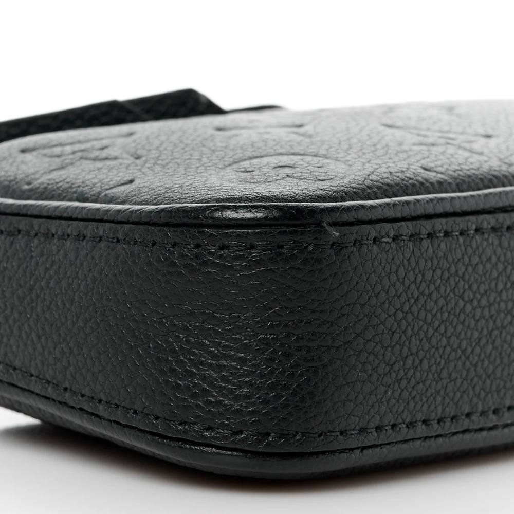 This Louis Vuitton Empreinte Easy Pouch On Strap in Black is crafted in empreinte monogram in black. It features an optional adjustable leather strap and gold hardware, with a top zipper opening to a gray striped fabric interior.
