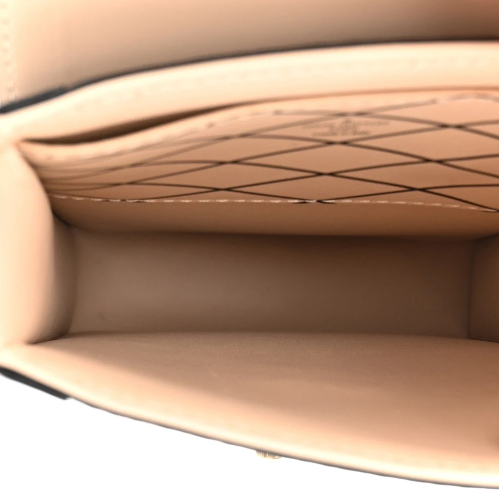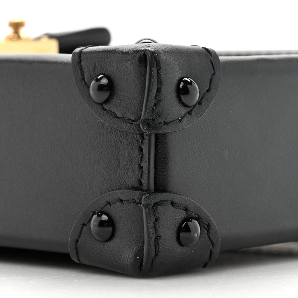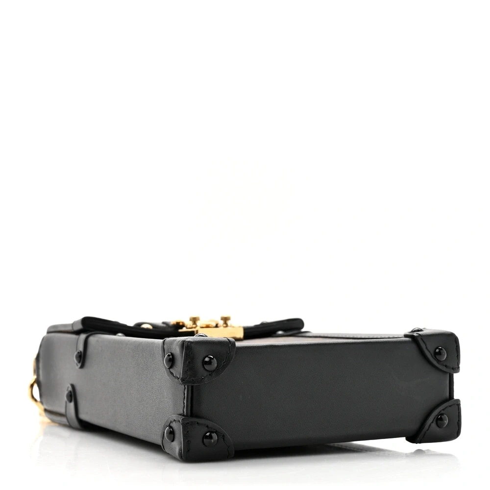 This Louis Vuitton Monogram Pochette Trunk Verticale in Black combines classic monogram canvas with modern versatility. The black calfskin trim, brass hardware, and front flap S-lock closure add timeless appeal, while the beige leather interior with a Malletage print adds a luxurious touch to this stylish clutch.