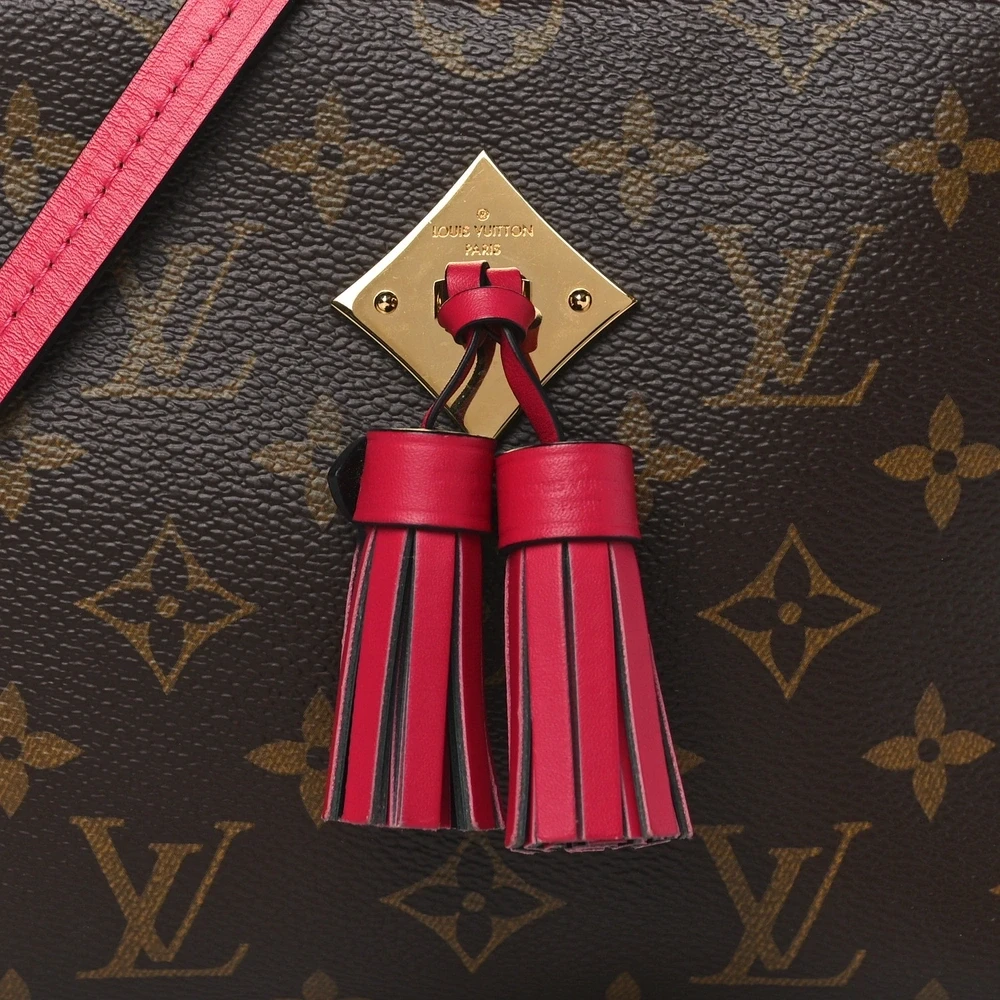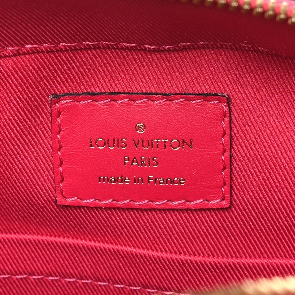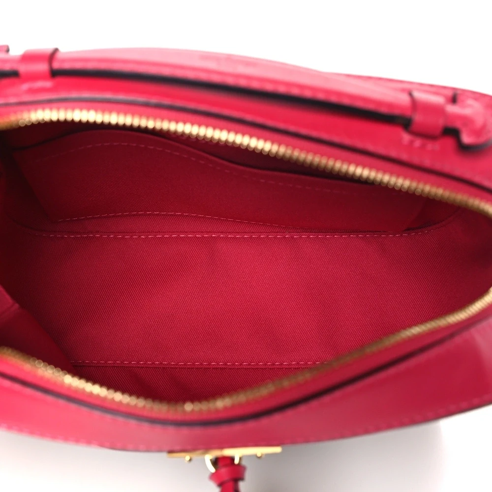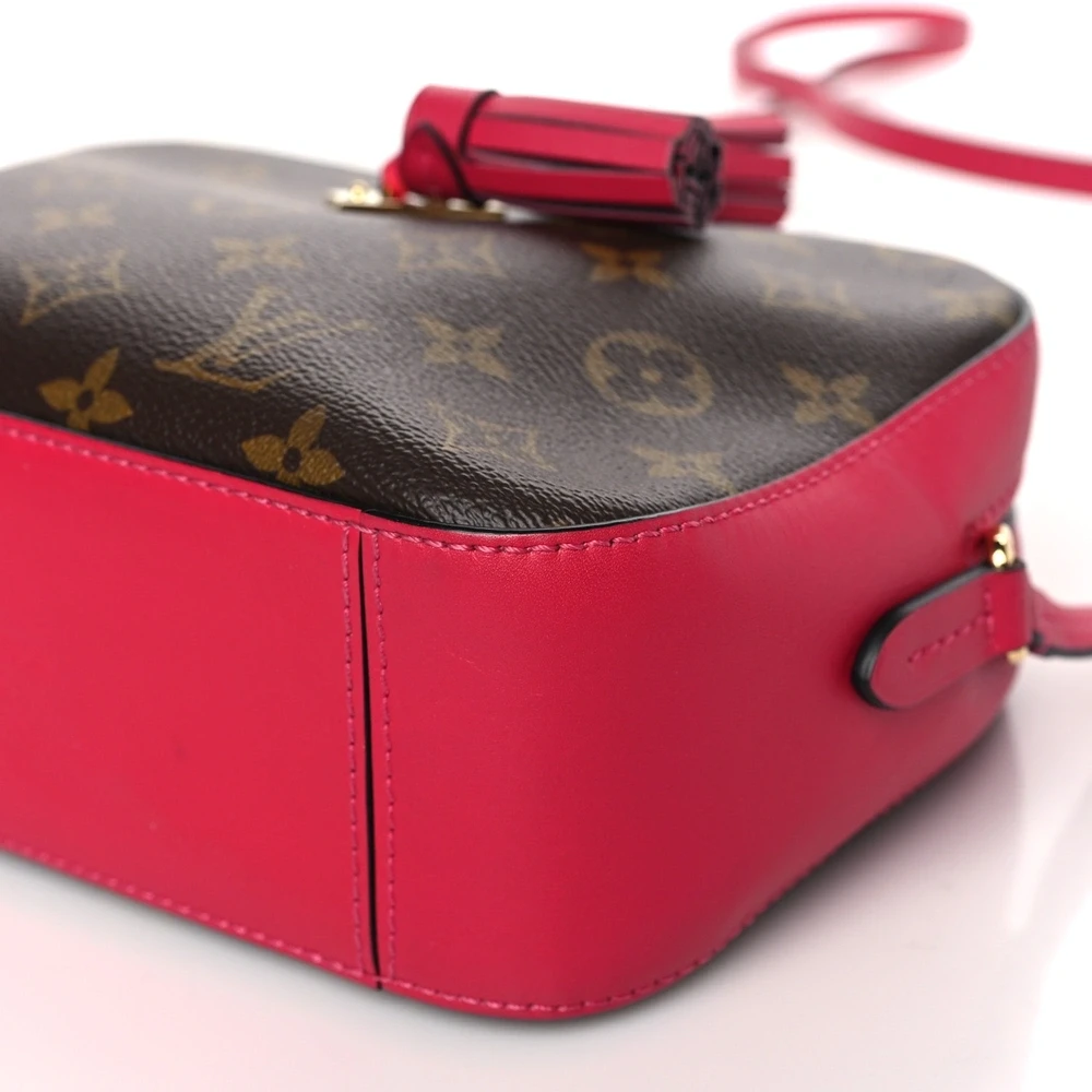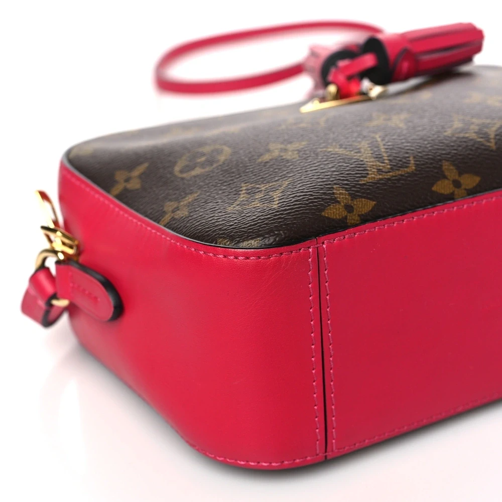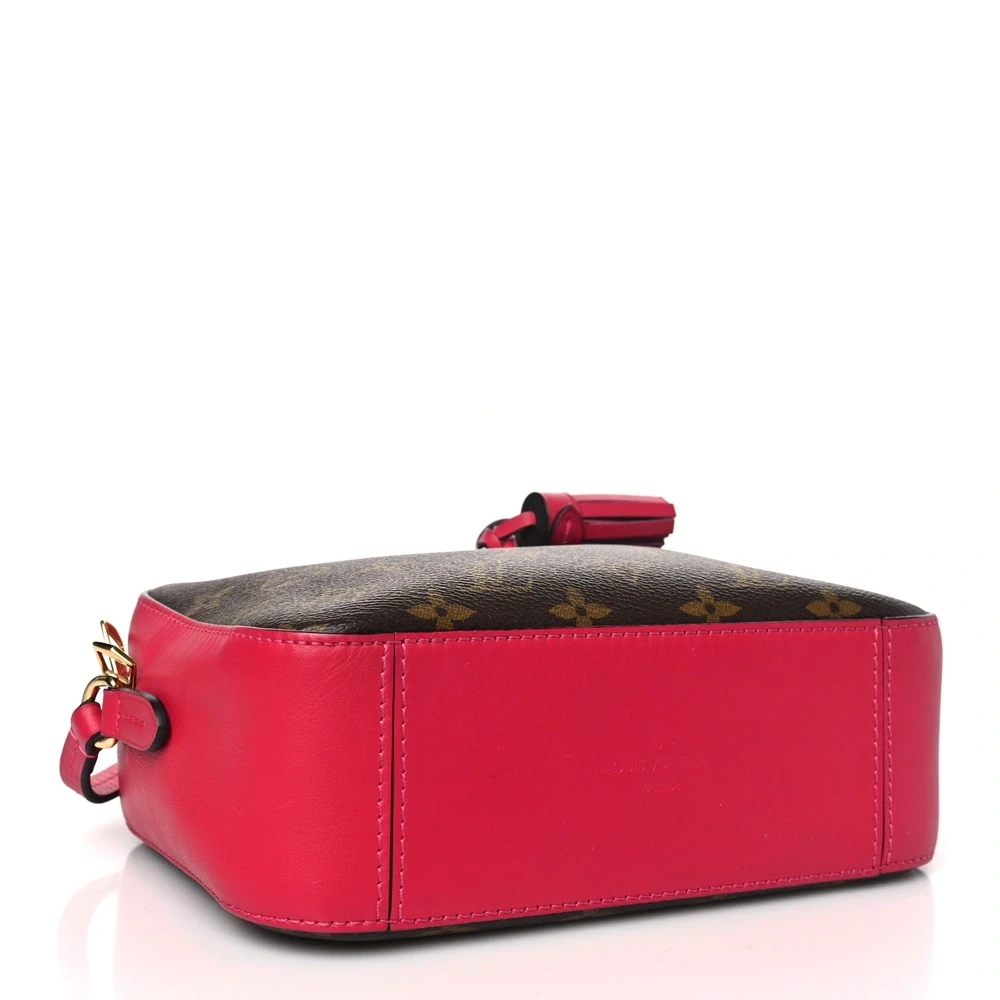 This Louis Vuitton mini crossbody is crafted of monogram coated canvas and features a dark pink calfskin trim, a shoulder strap, top handle, and polished brass hardware. The top zipper opens to a matching fabric interior with a patch pocket.