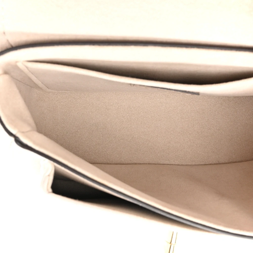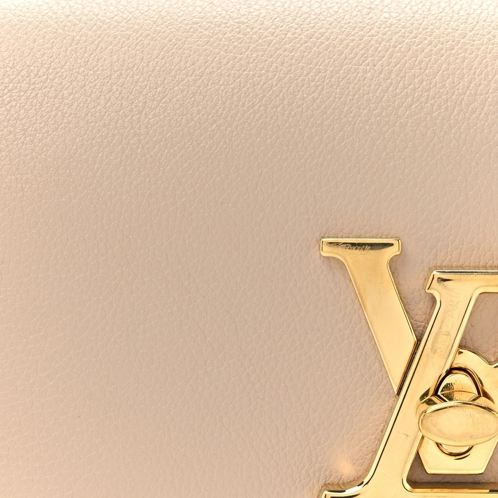 This Louis Vuitton Grained Calfskin Lockme Tender in Greige is a soft yet structured handbag in beige calfskin, enhanced by a gold chain strap and LV front flap closure. The beige microfiber interior with a pocket adds a touch of elegance, making it a refined choice for everyday use.