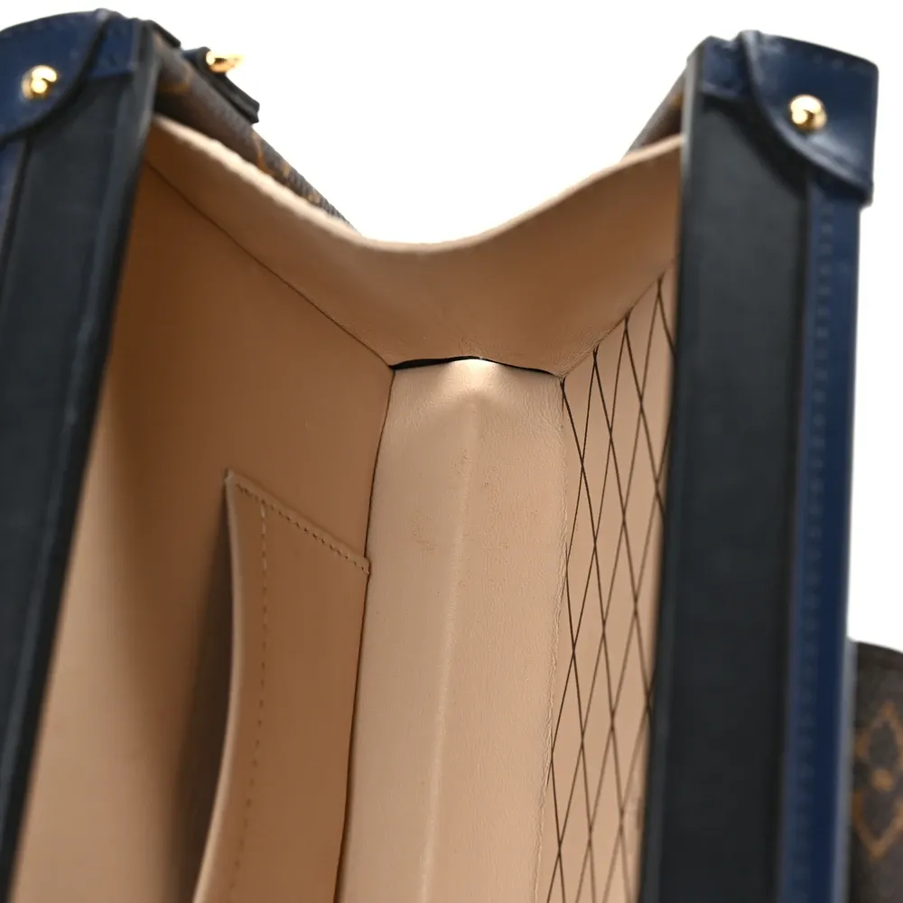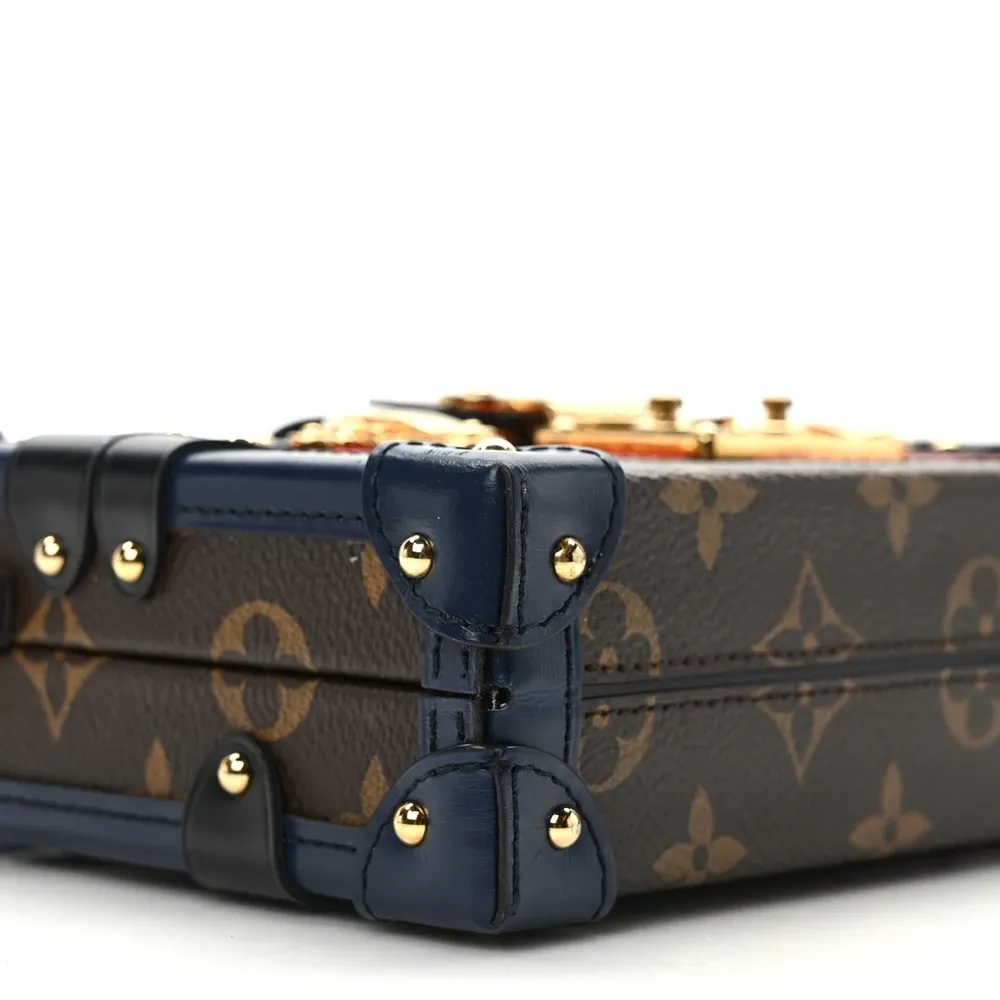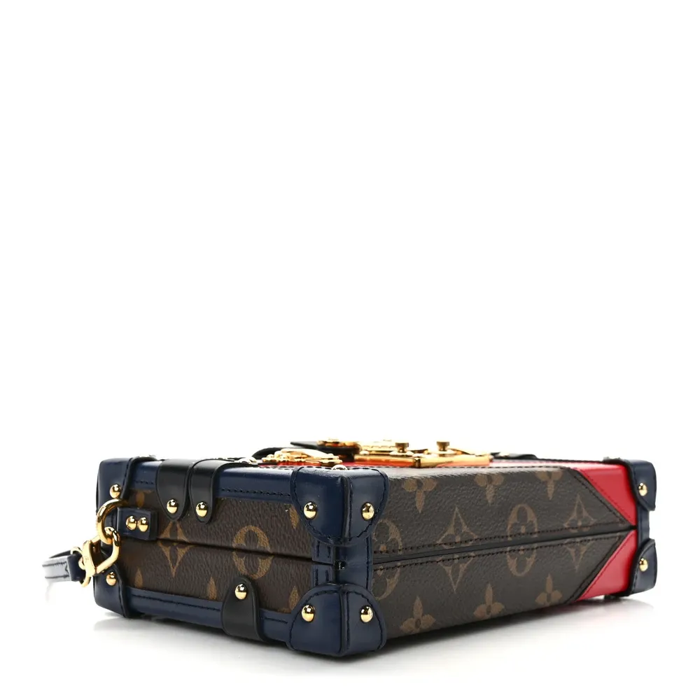 This Louis Vuitton Monogram Malletage Print Petite Malle in Marine and Rouge is crafted in monogram on toile canvas with red and black leather accents. It features brass hardware and a crossover strap with a press lock, opening to a beige leather interior with a card slot.