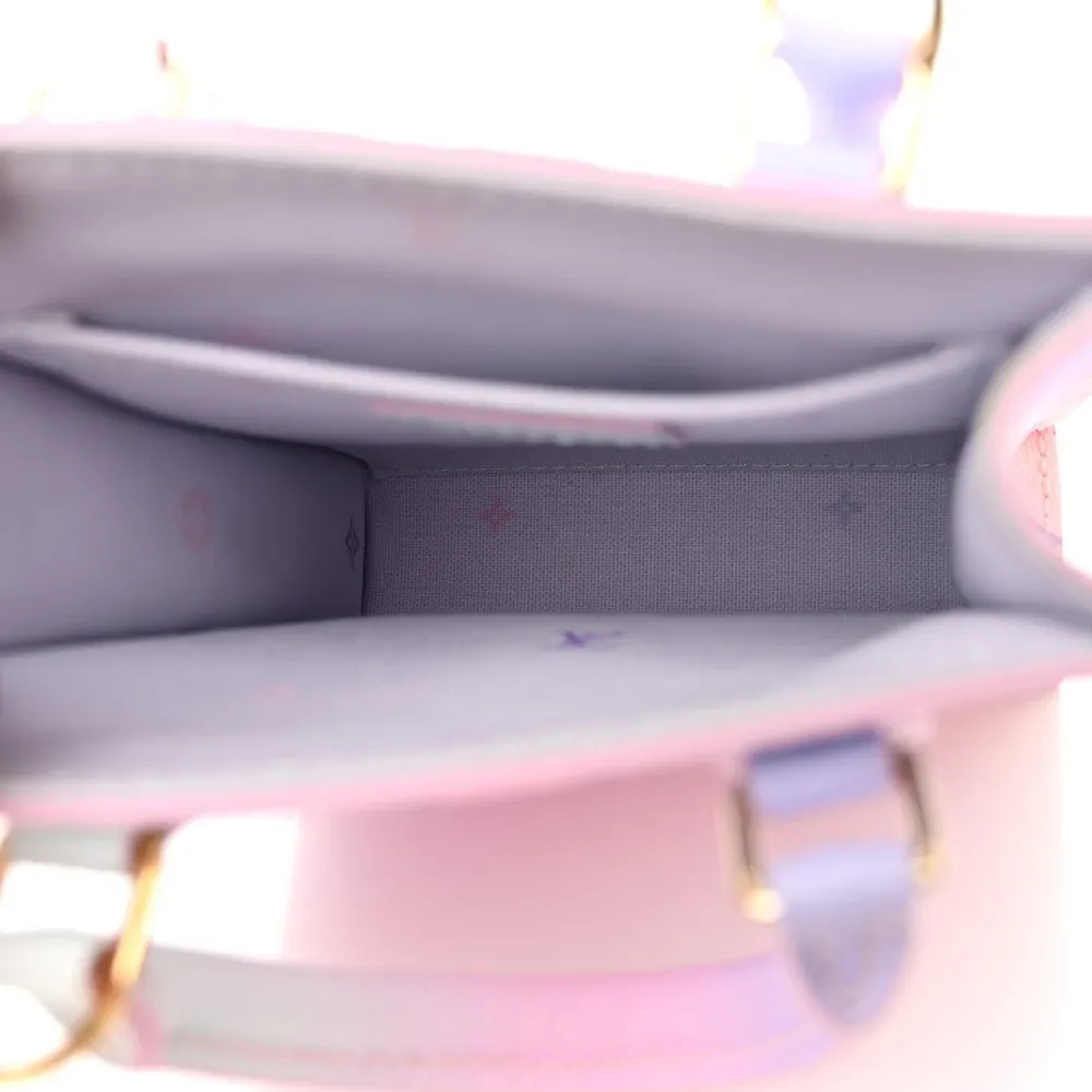 This Louis Vuitton Monogram Giant Spring In The City Petit Sac Plat in Sunrise Pastel is a limited-edition piece from the Spring 2022 collectsion, showcasing oversized monogram in pastel pinks and purples. Gold-tone hardware, toron top handles, and an optional adjustable strap add luxurious details to this mini tote, while the textile interior offers a charming contrast.