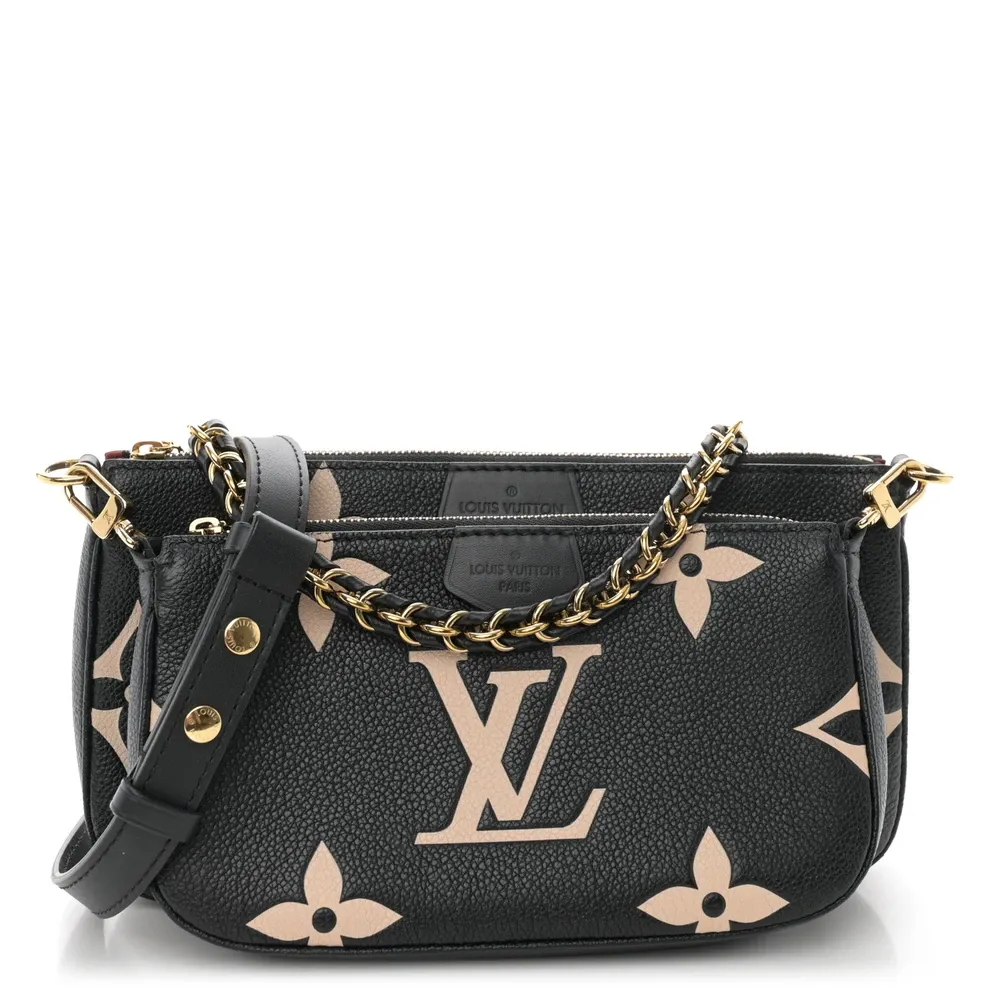 This Louis Vuitton Empreinte Monogram Giant Multi Pochette Accessories in Black and Beige is a versatile set crafted from monogram-embossed calfskin. The bag includes multiple pouches, a chainlink strap, and a shoulder strap, combining style and functionality with red microfiber interiors for a luxurious finish.