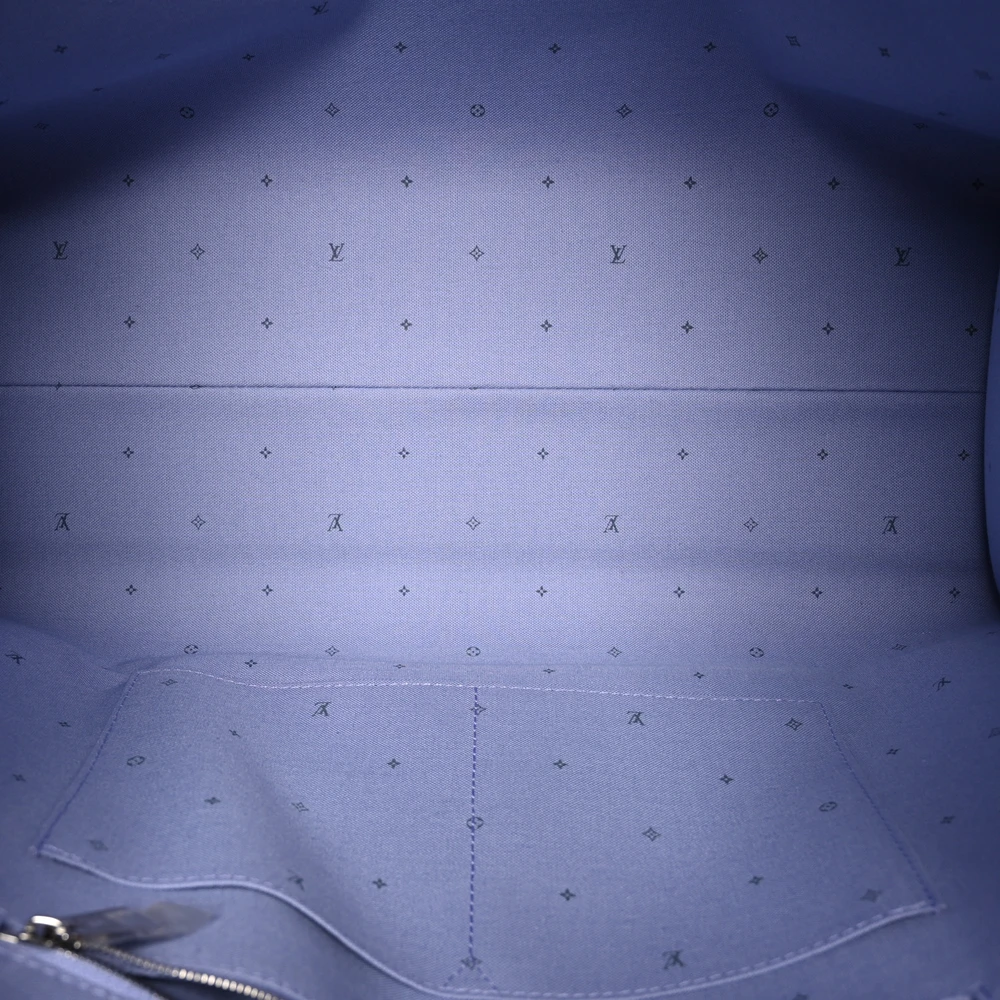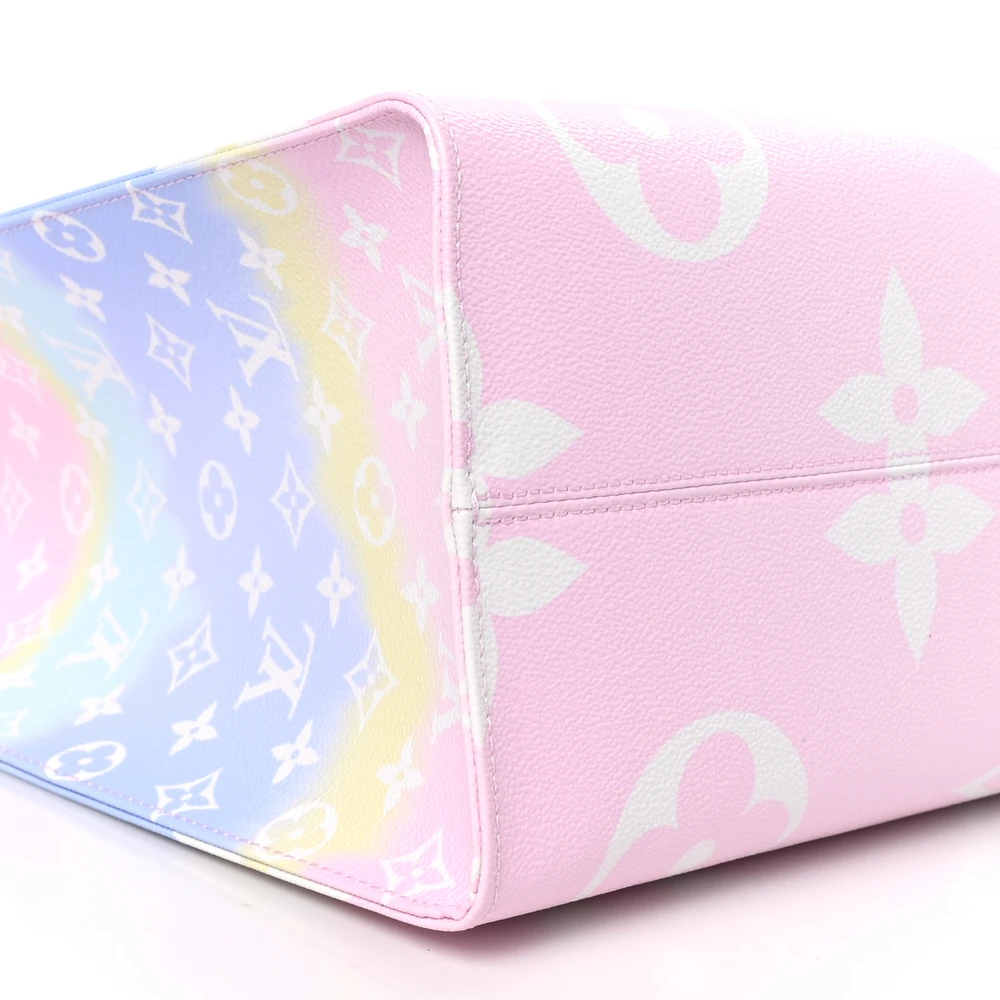 This vibrant Louis Vuitton Monogram Escale Onthego GM showcases a unique tie-dye pastel coated canvas with monogramming. The tote boasts pink rolled handles, matching long straps, and polished silver hardware. Its open top reveals a spacious light purple fabric interior with pockets, perfect for carrying everything you need in style.