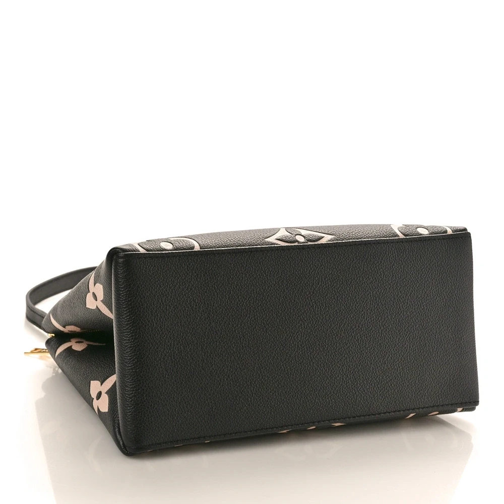 This Louis Vuitton limited edition handbag is crafted of black calfskin leather embossed with an oversized Louis Vuitton monogram in beige. The bag features black leather top handles and gold hardware. The top zipper opens to a spacious black interior with patch pockets.